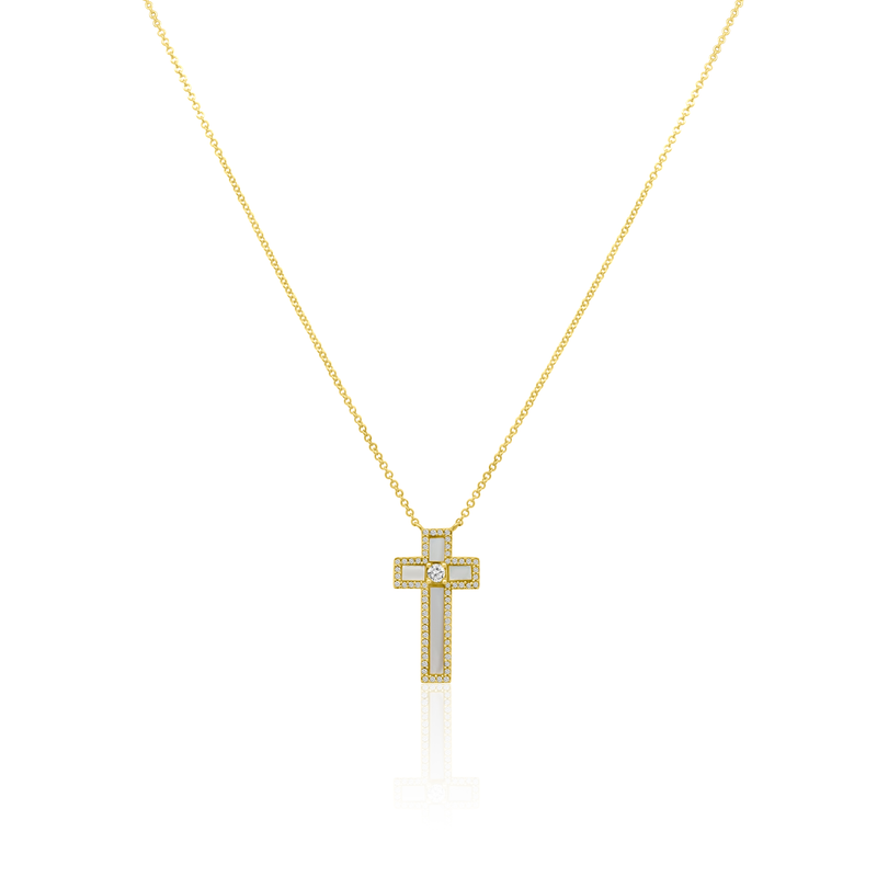 mage of a yellow gold safety pin necklace with pavé diamonds around the clasp
