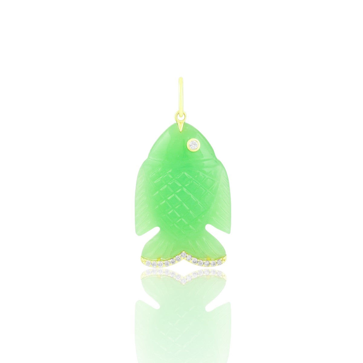 Dive into coastal charm with our stunning carved  Green Chrysophrase Océane Fish Pendant, a natural work of art that brings ocean vibes to any look. This little swimmer features intricate detailing and a shimmering diamond-studded tail that catches the light beautifully. Perfect for adding a pop of color to your layers.