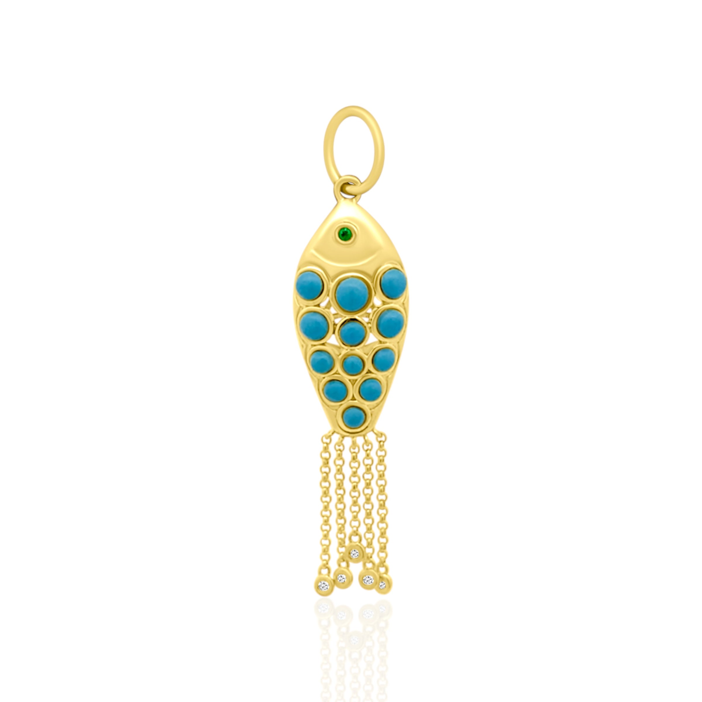 Our Tassel Fish Pendant is adorned with vibrant turquoise cabochons and five sparkling bezeled diamonds dangling from a delicate chain tassel. The tassel design adds movement and personality. Perfect for anyone who loves ocean-inspired charm with a touch of sparkle. This tiny treasure will bring you joy and whimsy every day.