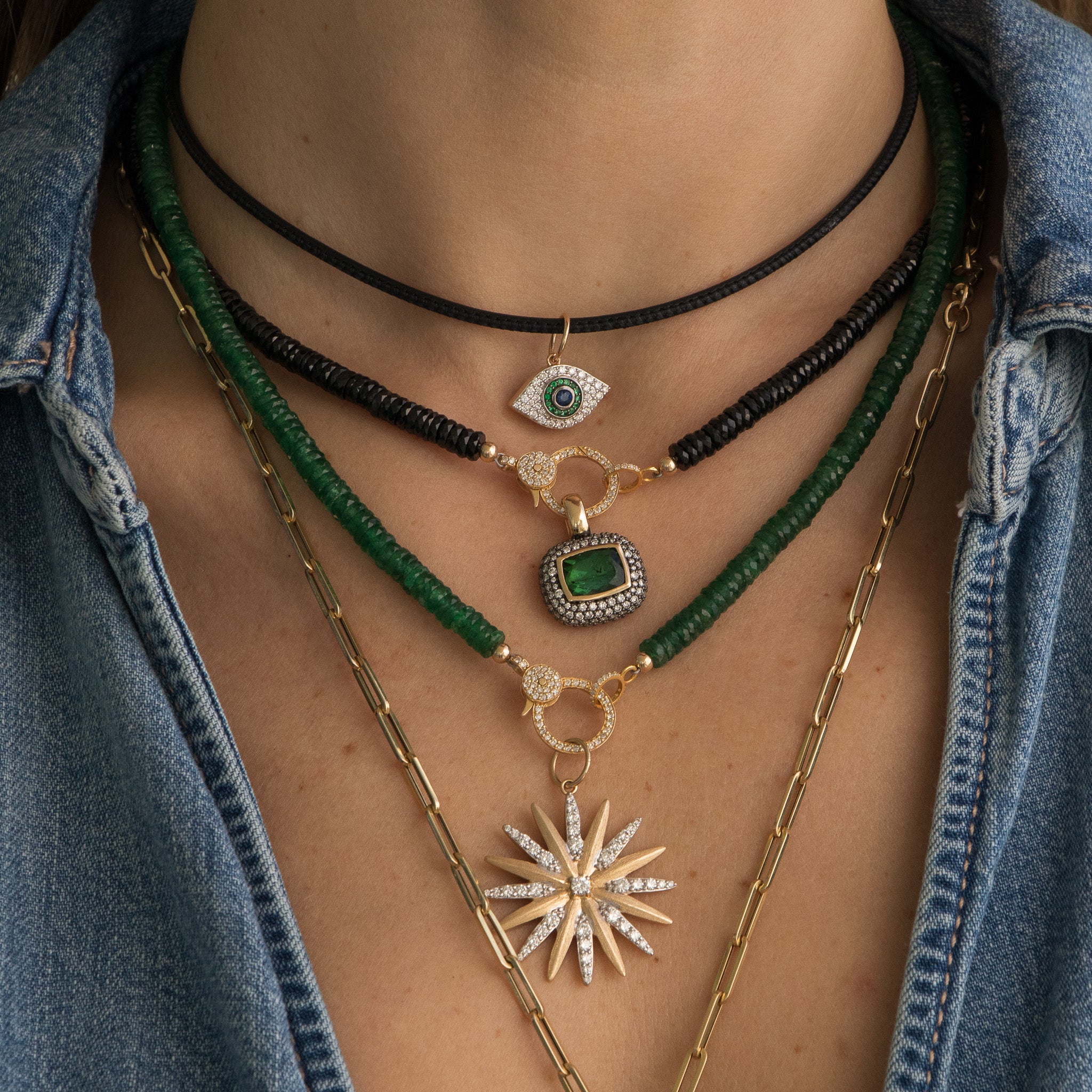 This double sided pendant hides a secret! On one side, a dazzling evil eye composed of emerald, sapphire, and pave diamonds. On the other, a starburst of gold etched to perfection. Keep your evil eye out for admirers!