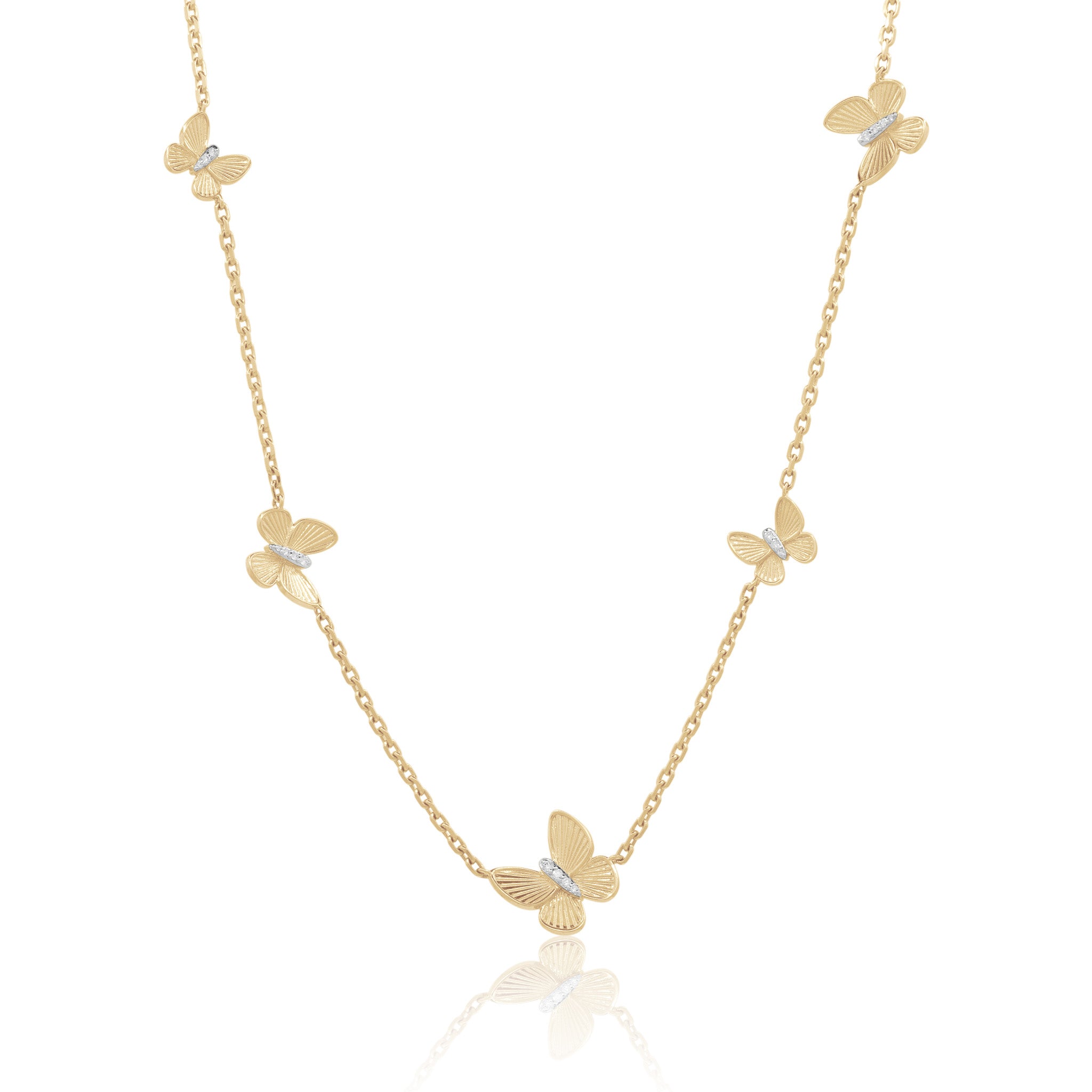 Crafted in 14kt yellow gold, this Linked Fluted Goddess Butterfly Necklace features 5 fluted butterflies with pave diamond bodies. Inspired by our signature Goddess Butterfly Pendant, this elegant design adds a refined touch to any ensemble, making it a timeless piece for those who appreciate subtle sophistication.