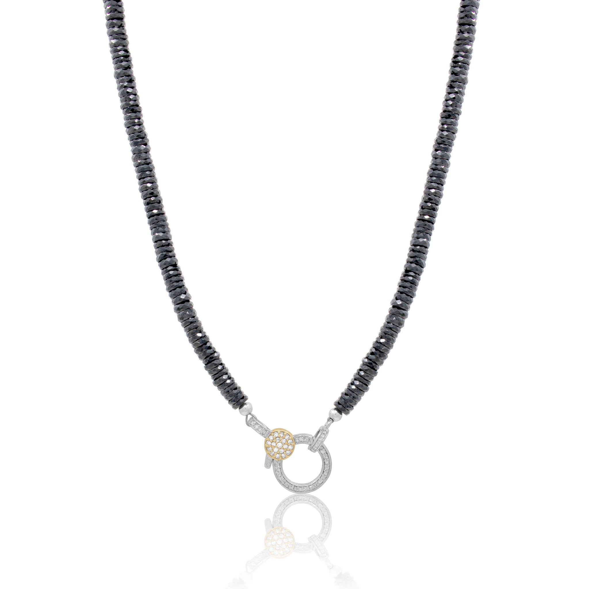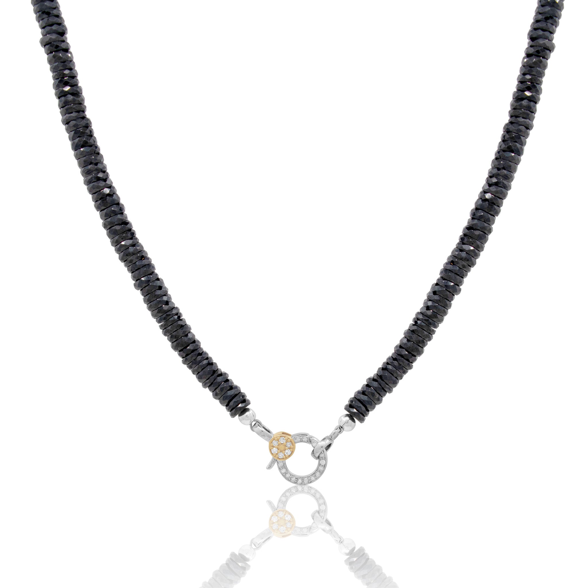 Our Two Tone Black Spinel Necklace features micro faceted Black Spinel heshi beads with a two tone 14kt yellow gold and sterling silver pavé diamond clasp. Perfect for layering or wearing solo, this necklace transitions effortlessly from day to evening, making it a versatile addition to any jewelry collection.