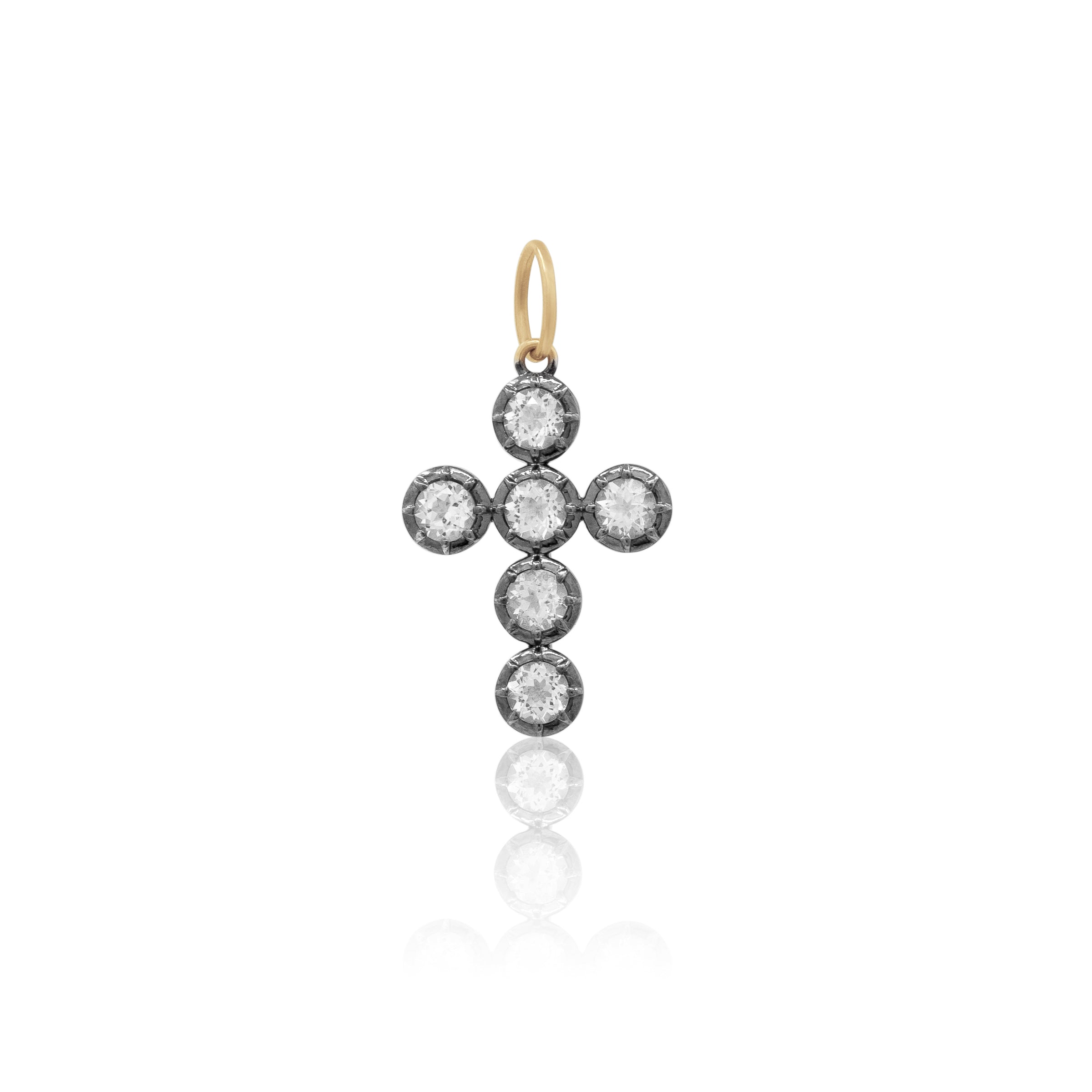 This charming 14kt Victorian Topaz Cross features 6 outstanding faceted white topaz stones. Finishing off with black rhodium plating for an enchanting vintage feel. Whether worn as a personal symbol of faith or simply as an accessory, this cross adds a touch of genuine antique allure.